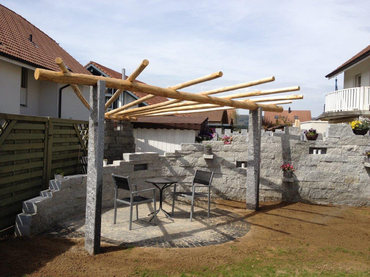 Holzpergola aus Kastanienholz vor einer Natursteinmauer und wildförmigen Maggia Gneis Bodenplatten.