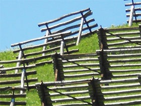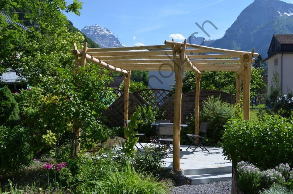 Pergola Überdeckungen, Holzpergola, Staketenzaun, Palisaden, Lawinenverbauungen, Hangabstützungen, Uferbefestigungen aus massivem Bauholz.